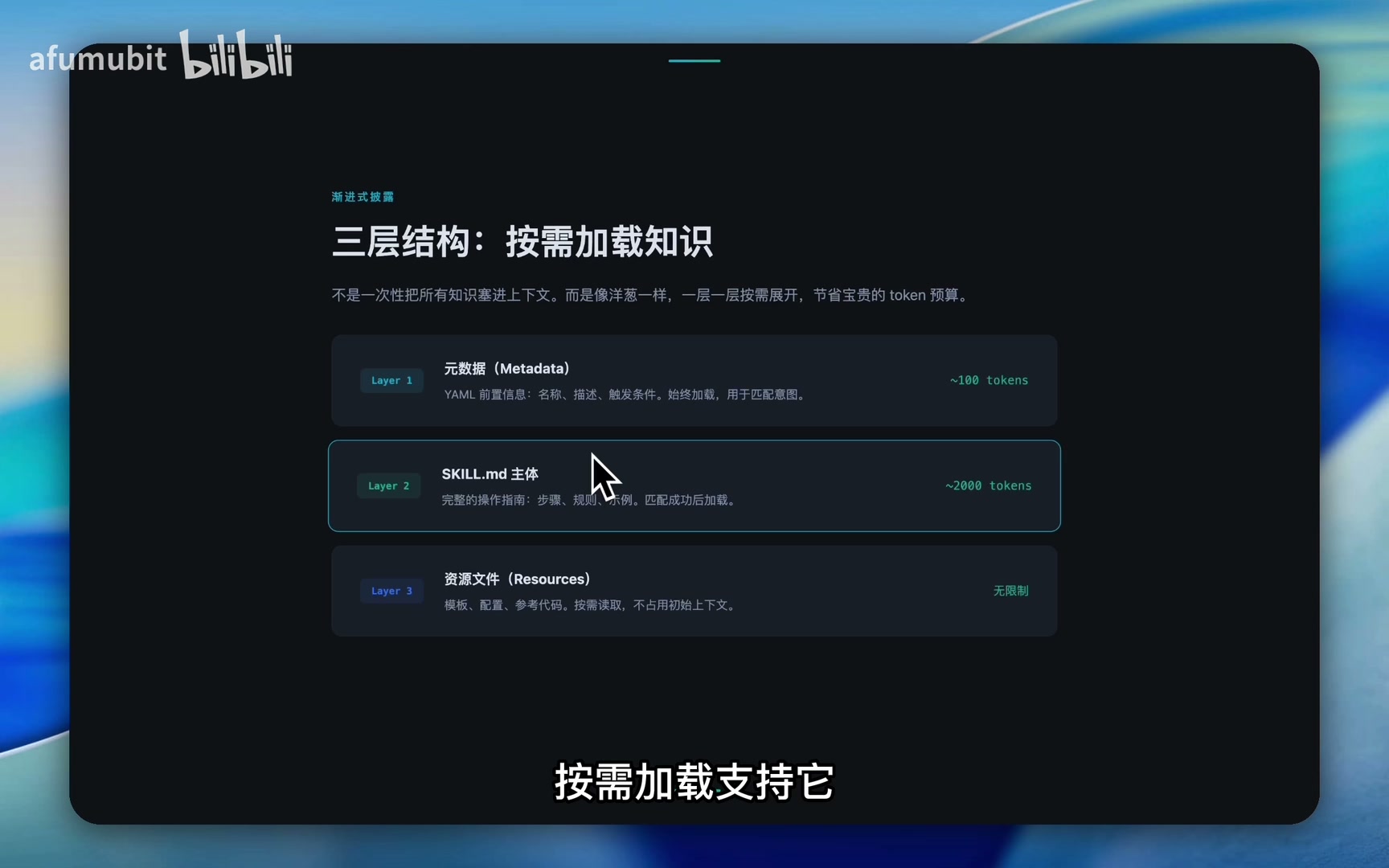 - 元数据 (Metadata):名称、描述、触发条件。始终加载(节省 Token)。
