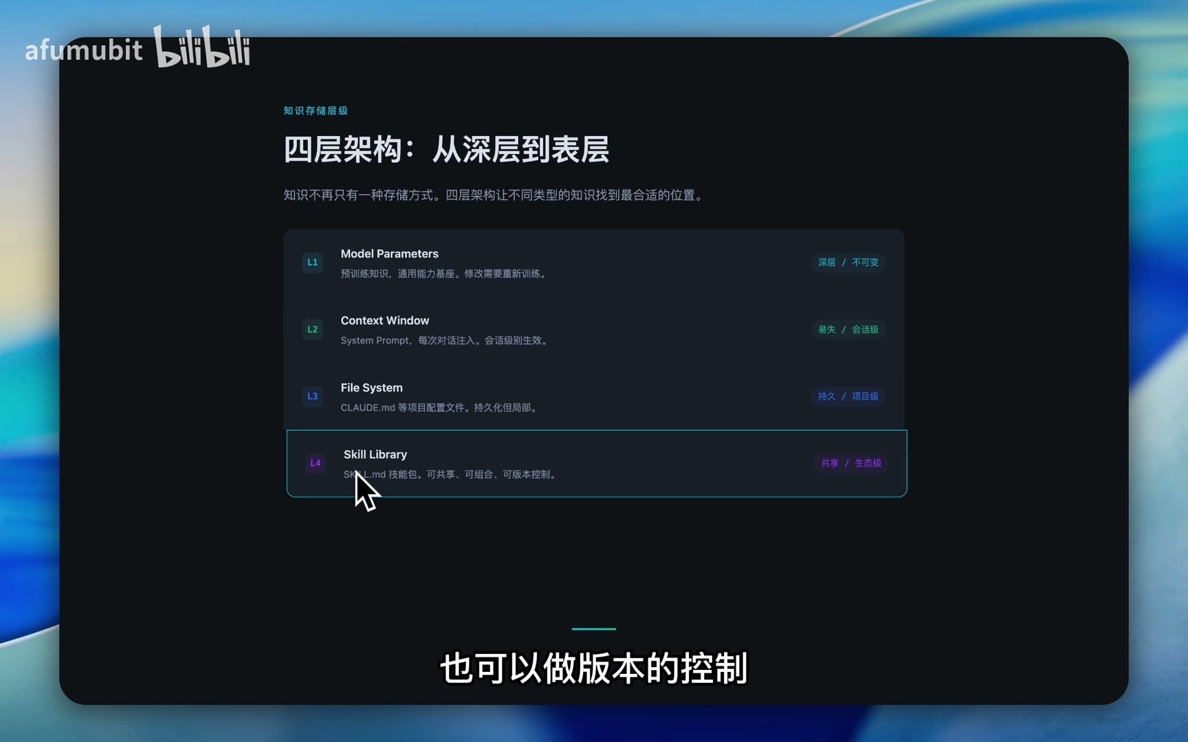- Skills 系统:知识从参数中解放,存储为 SKILL.md 文件,三层渐进披露节省 Token(V4)。