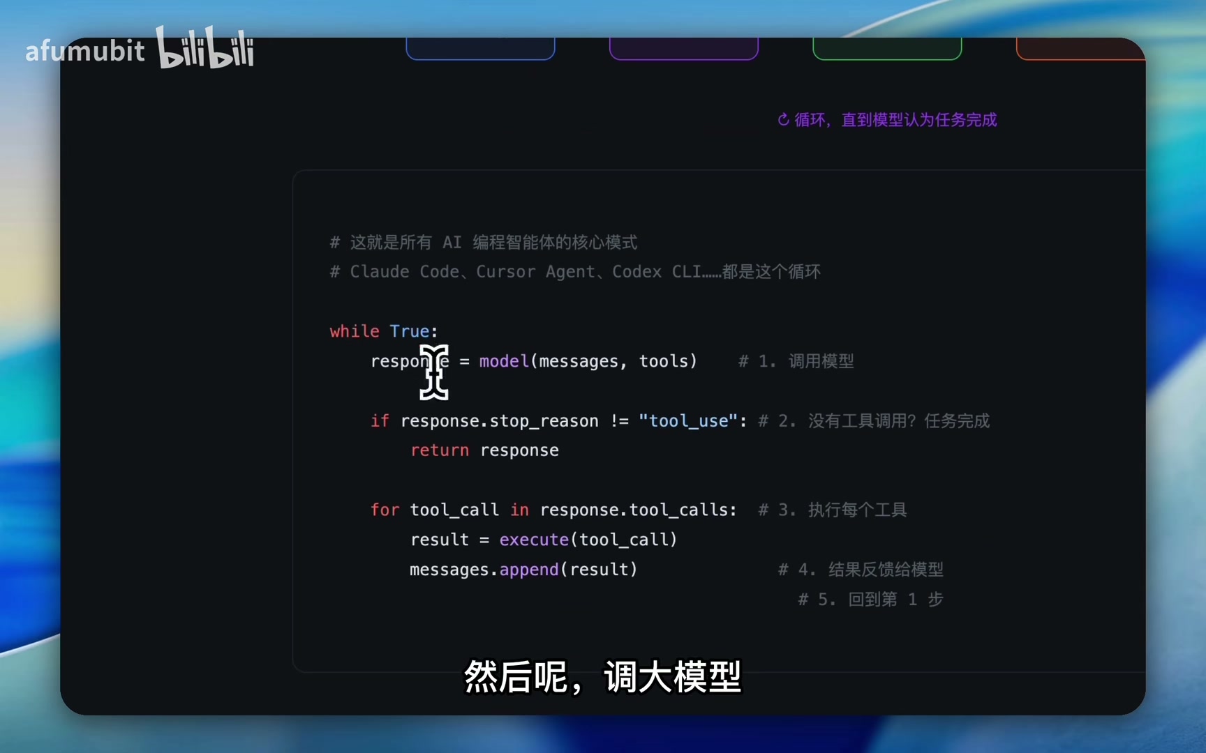 - Agent = While 循环:核心永远是调用模型、执行工具、返回结果、不断重复。