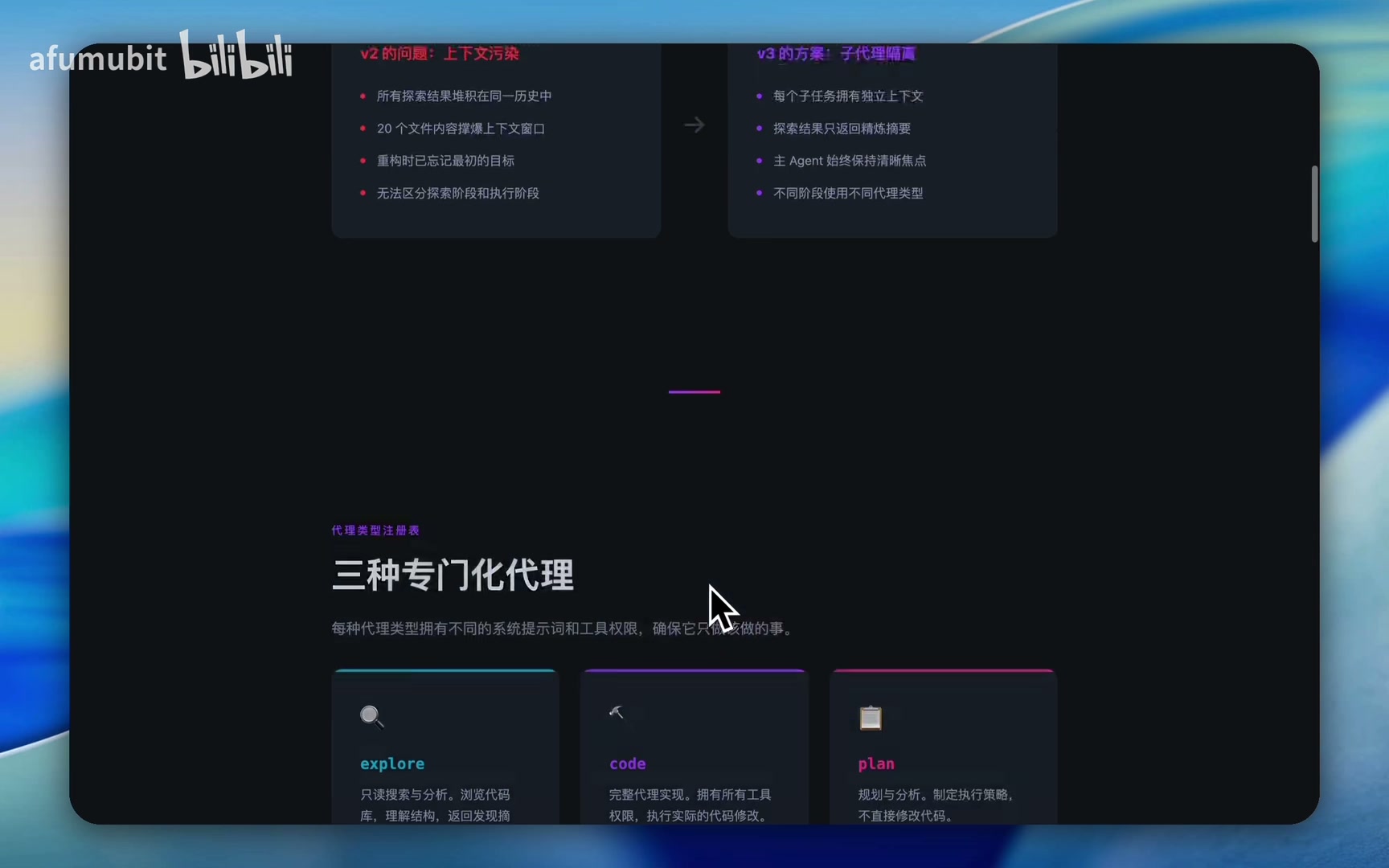 Todo列表和硬约束,解决了长任务中的遗忘和跑偏问题。 - V3 引入子代理机制和角色分工,通过上下文隔离解决了复杂任务的焦点分散和 Token 消耗问题。